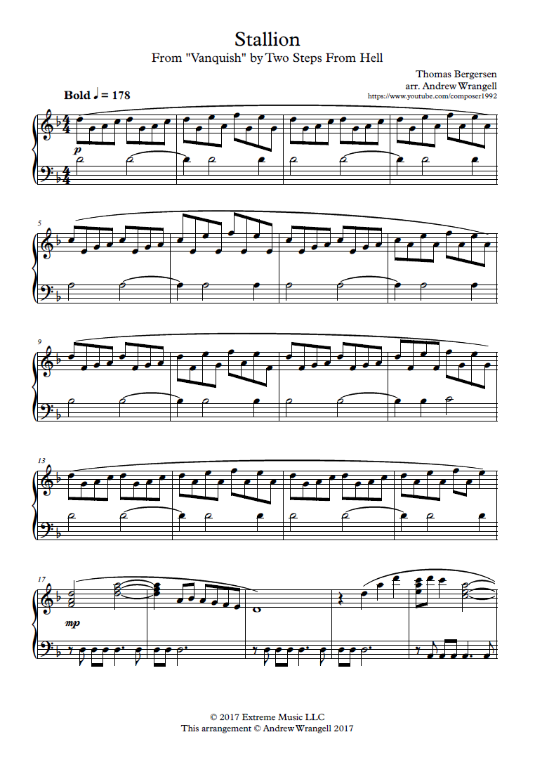 This contains PDF piano sheet music for Andrew Wrangell's arrangement of Stallion by Two Steps From Hell.