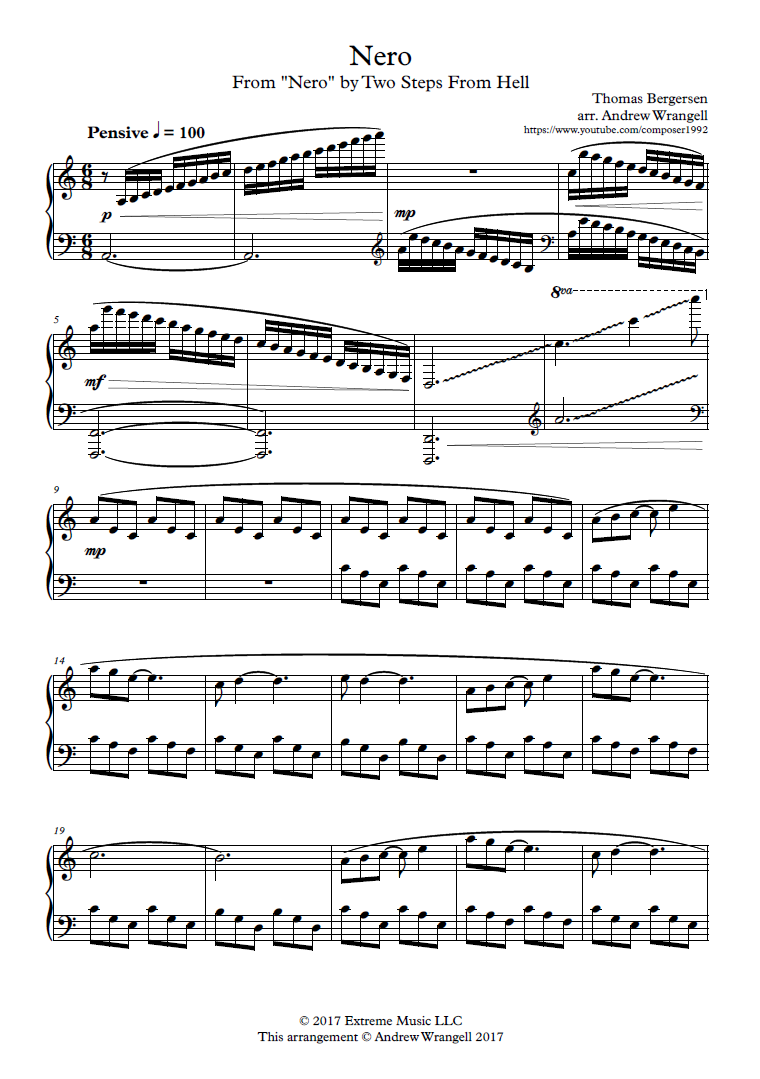 This contains PDF piano sheet music for Andrew Wrangell's arrangement of Nero by Two Steps From Hell.